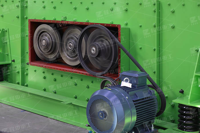 三軸橢圓篩的激振器是由三根并列的振動軸組成,位于篩箱一側(cè)的振動軸的一端裝有速比為1的互相嚙合的三個齒輪; 振動篩工作時(shí),電機(jī)皮帶傳動裝置帶動激振器的三個齒輪旋轉(zhuǎn),由于三根軸上均裝有相等的偏心質(zhì)量、相同的偏心半徑的配重盤,由等參數(shù)的齒輪同步連接,因此篩箱的運(yùn)動軌跡呈現(xiàn)為橢圓形,即單軸振動篩的圓運(yùn)動軌跡和雙軸振動篩的直線運(yùn)動軌跡的合成運(yùn)動軌跡。橢圓的運(yùn)動軌跡可以使物料擁有更大的運(yùn)行速度,提高設(shè)備的產(chǎn)量。